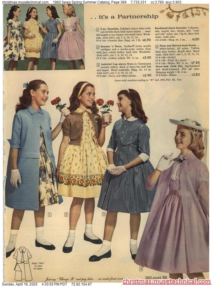 While men's fashions didn't change much thru the years (nice shirt, slacks and later jeans), ladies fashions changed quite a bit! Pictured here is a page out of the Sears catalog, 1961. While we were still in kindergarten, our dresses looked a lot like these! Oh, and hats were still in vogue for church.