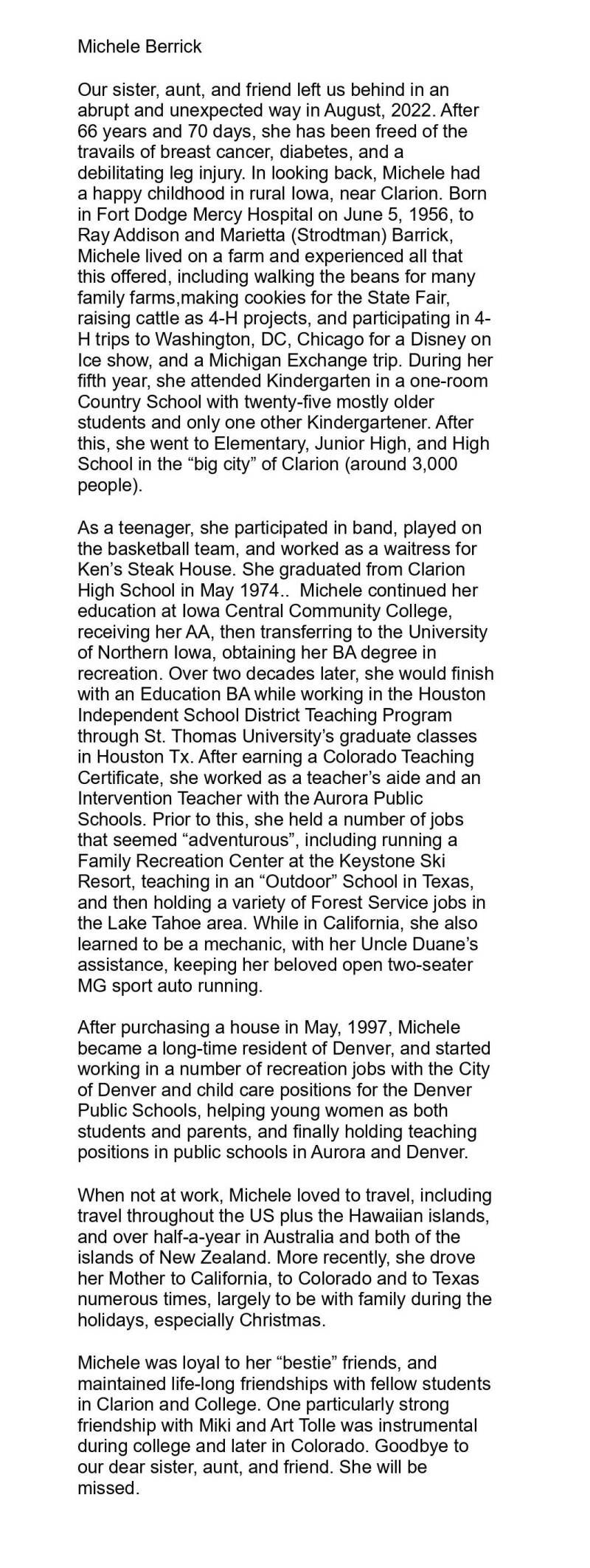 Sherry is survived by her parents, Morris and DiAnn Peterson of Clarion; brother Jerry Peterson and lifelong friend Cindy Peterson of Milford, and brother Terry Peterson (Julie Butler) of Clarion; nephews Ted (Kendra) Peterson and their daughter of Clovis, California, Jeffrey Peterson of Fort Collins, Colorado, Vance Peterson (Jenny Good) and her daughters of Milford, and Jacob Peterson (Sydney Hersom) of Emmetsburg.